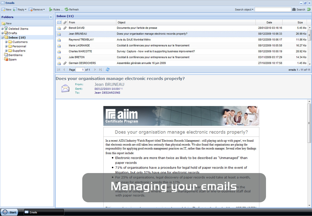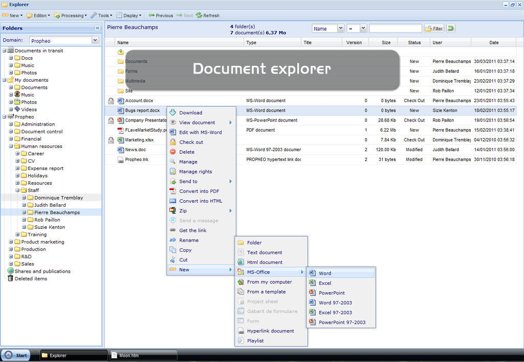 File sharing and document management can fast become a nightmare for a SMB. There are many solutions available but most are costly and complicated. Propheo offers an integrated software suite and comprehensive set of tools. This software is easily installed to your IT infrastructure while being highly secure. Propheo is not only easy, but affordable for your organization.